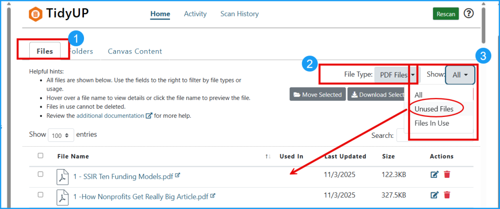 - Assess/ delete Unused PDF files that do not appear in the “Used In” column (not linked or embedded in the course)