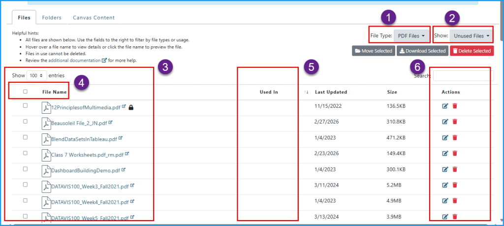 - Assess/ delete Unused PDF files that do not appear in the “Used In” column (not linked or embedded in the course)