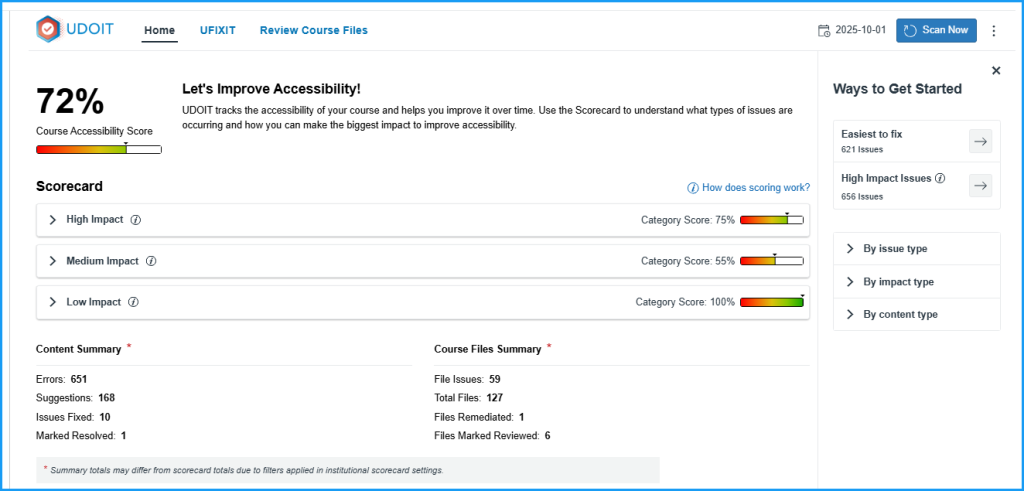 Use the Scan Now button in any of UDOIT’s three sections (Home, Ufixit, Review Files) to manually scan a course. A UDOIT Scan will return both accessibility errors, and suggestions for possible issues to check.