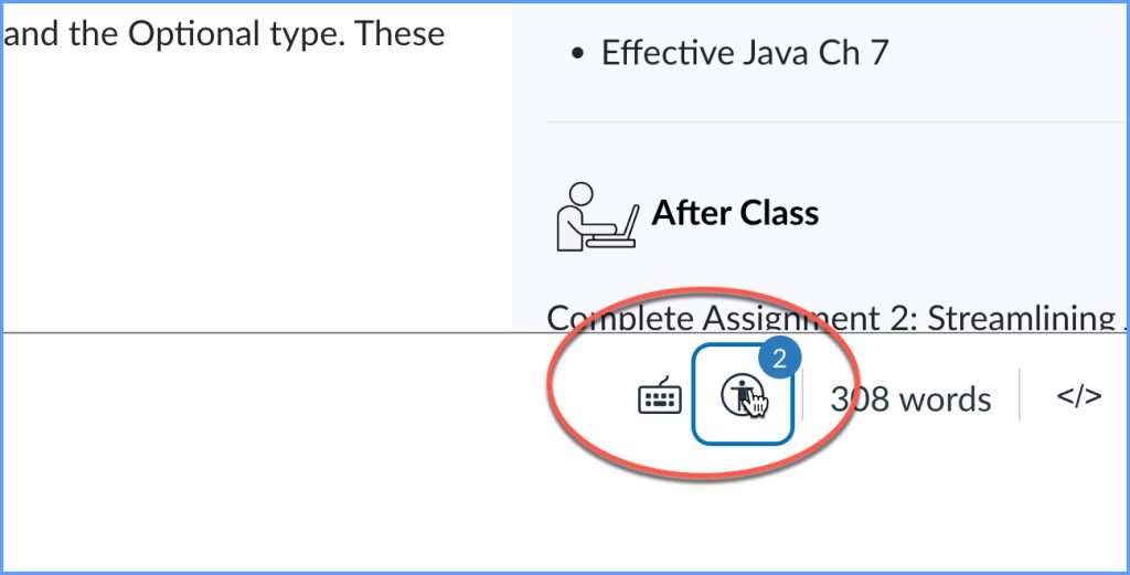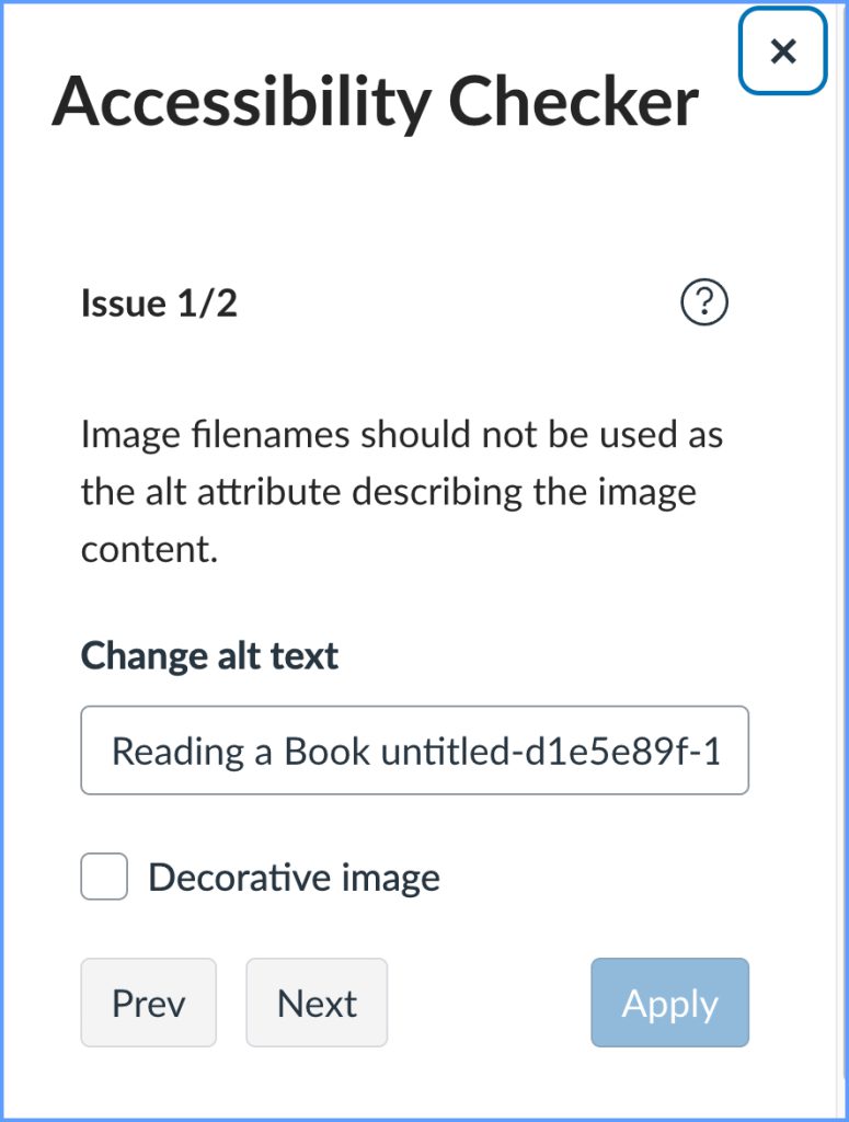 The Rich Content Editor used throughout Canvas includes an accessibility tool that checks common accessibility errors within the editor. This tool will only verify content created within the Rich Content Editor for the content that you are currently editing.